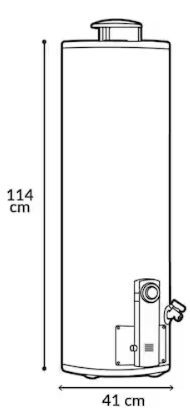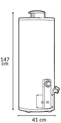 Es un calentador de gas natural, con una capacidad de 106 litros y pensado para hasta 3 servicios. Su encendido es de chispa y no requiere una presión de agua establecida para funcionar. Viene en forma cilíndrica y sus dimensiones son de 41 x 147 cm.