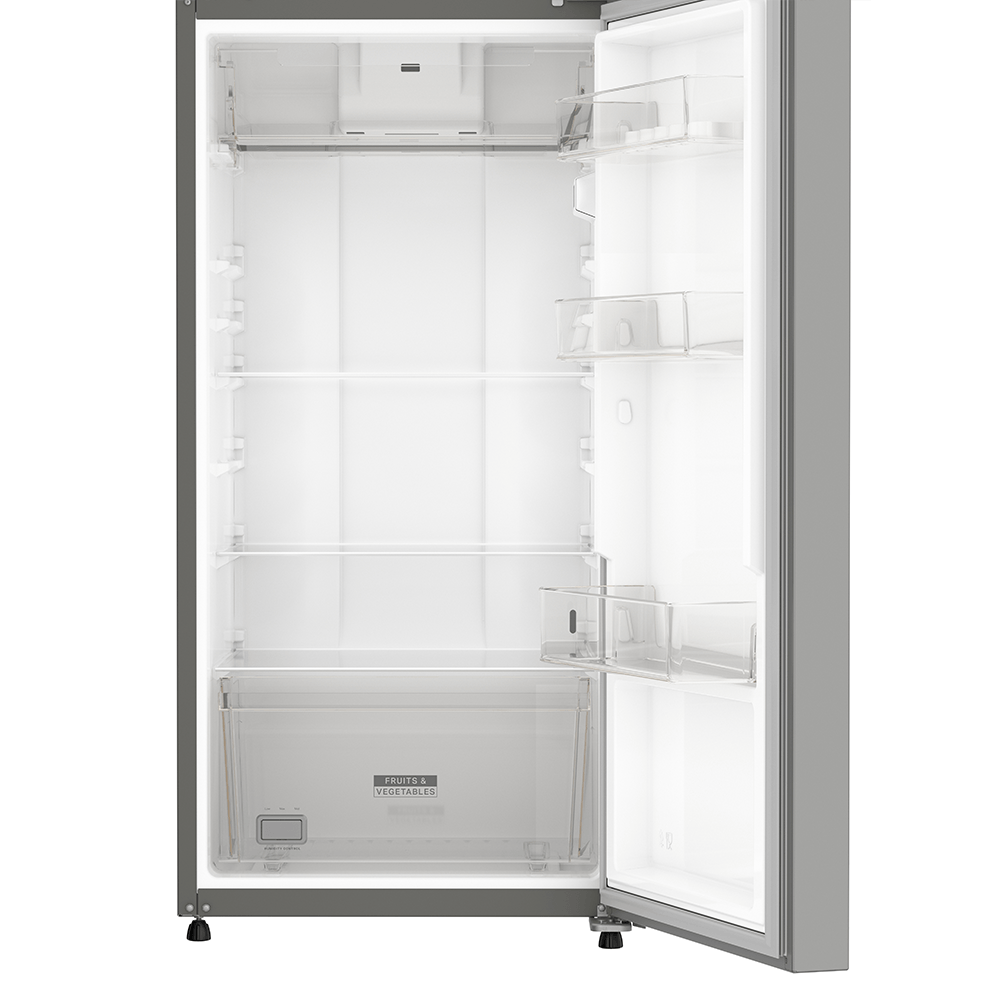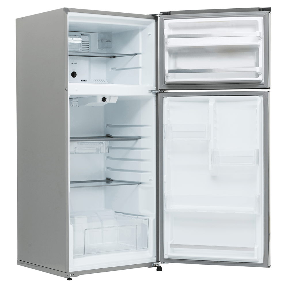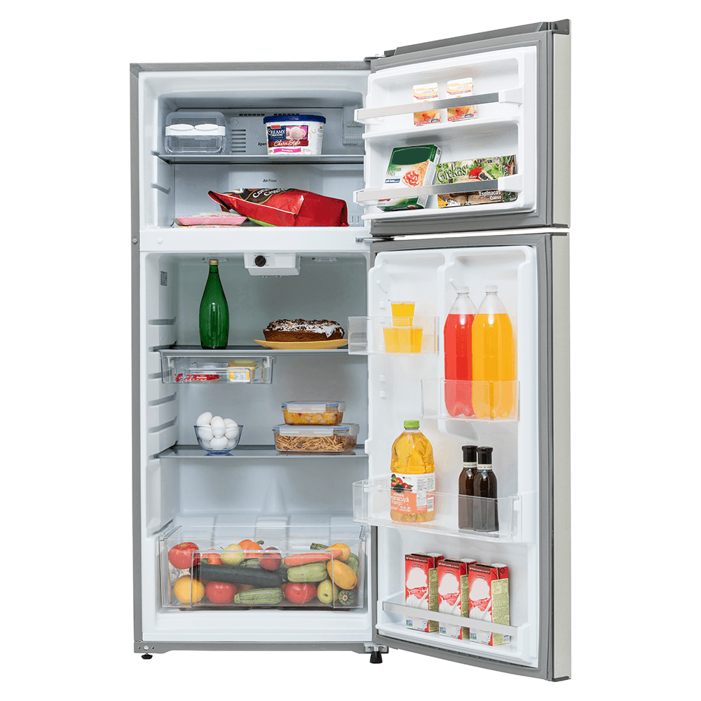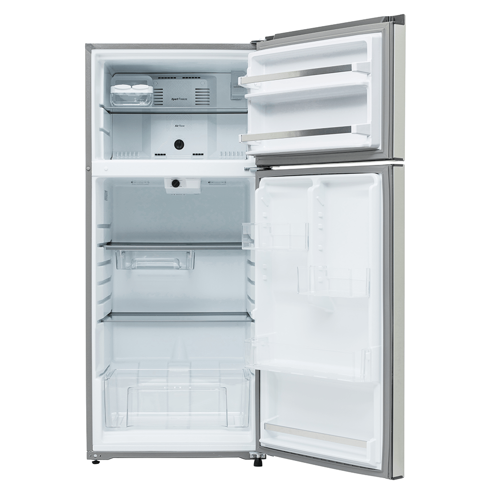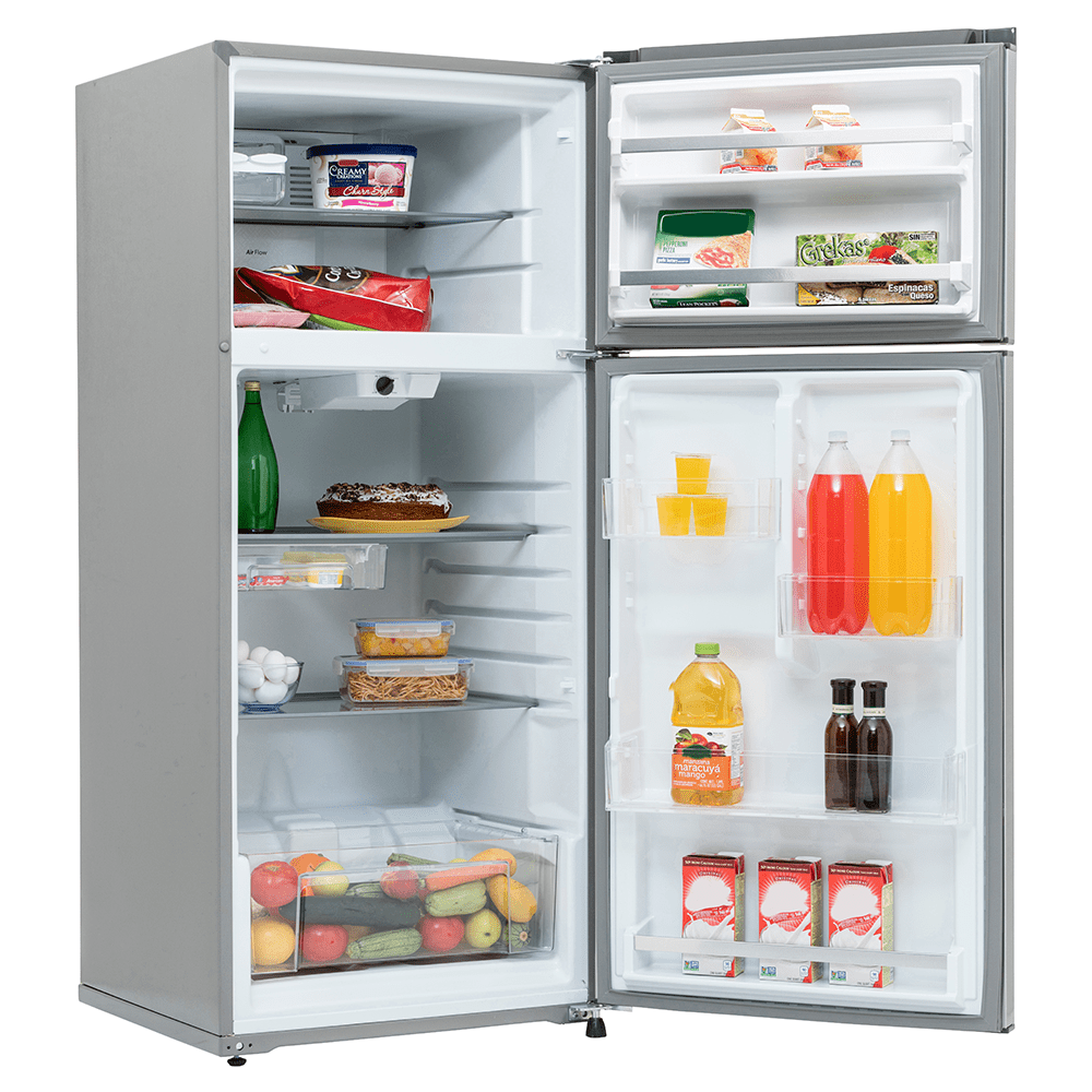 Refrigerador Top Mount 395 L / 14 p³ color Acero Inoxidable. #1 en manejo de espacio con Xpert Spaces con 50% más espacio para tus frutas y verduras*, cuenta con puerta reversible y luz LED para una mayor visibilidad de tus productos favoritos, sistema de evaporador sencillo, sistema de deshielo Auto Defrost, cubierta de cajón para legumbres y charola para hielos. Además incluye 3 parrillas de cristal templado, cajón con control de humedad para frutas y verduras con cubierta de cristal templado, cajón para carnes frias, un anaquel con capacidad de galón y 2 fijos. *Prueba controlada simuladora de capacidad y organización en cajones de frutas y verduras con hasta cierto peso en kilogramos.