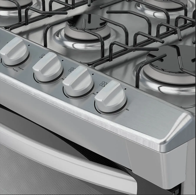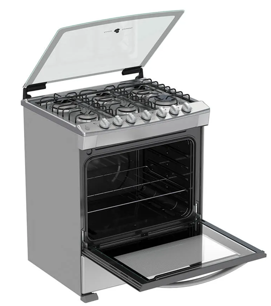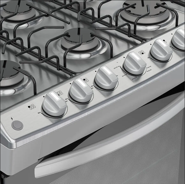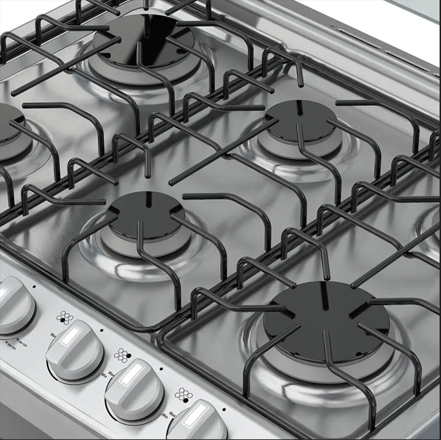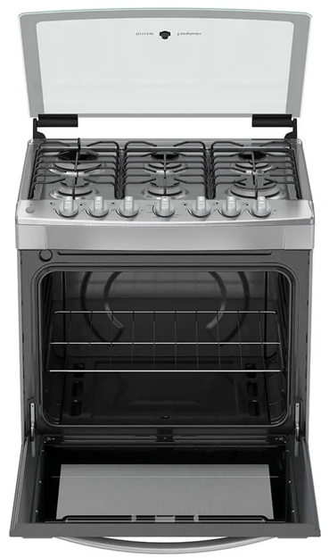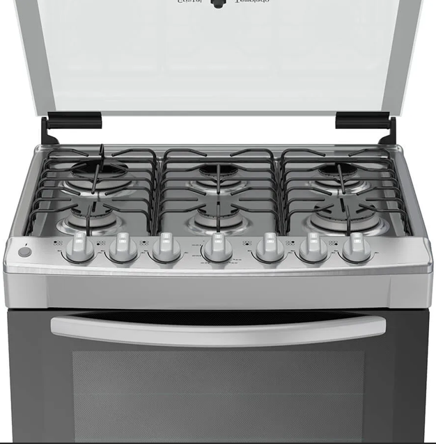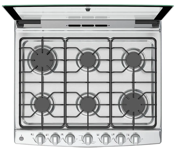 - Respaldo de cristal templado, cubierta de Acero Inoxidable, 3 parrillas de hierro fundido y 6 quemadores: 4 Estándar y 2 Súper. Perillas ergonómicas Push & Turn.