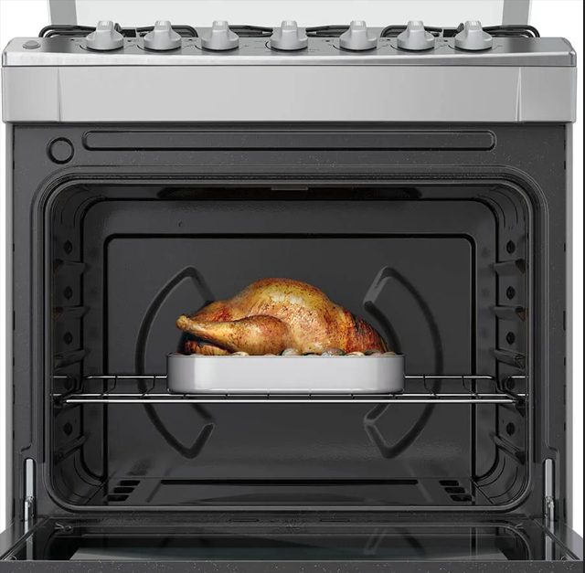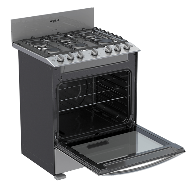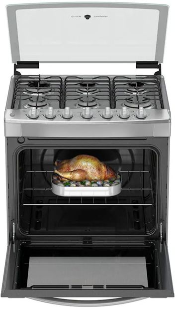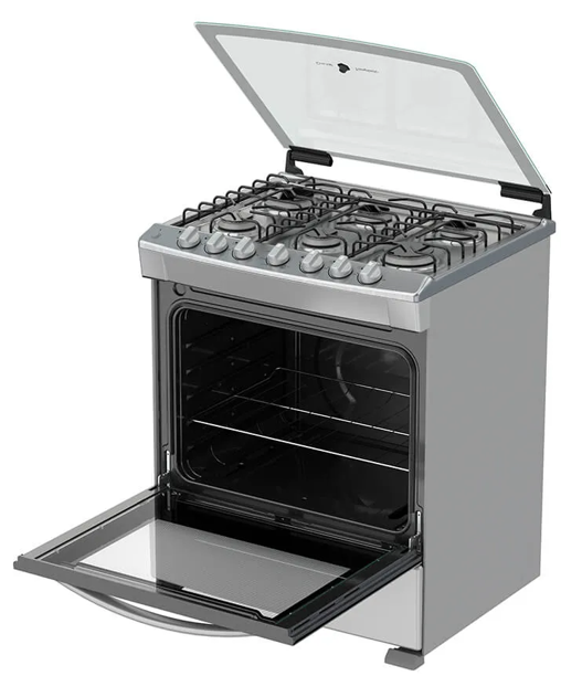 Estufa al piso de 30″ a gas que cuenta con 6 quemadores y 3 parrillas de alambrón, superficie de acero inoxidable sellado y capelo de cristal templado. Panel inclinado con perillas ergonómicas y encendido electrónico de botón. El horno, con ventana panorámica para una mejor vista y control del horneado, cuenta con jaladera de una sola pieza y sistema de cerrado suave, acabado en cerámico negro diamante, 1 parrilla fija , encendido manual y temperatura termogrados.