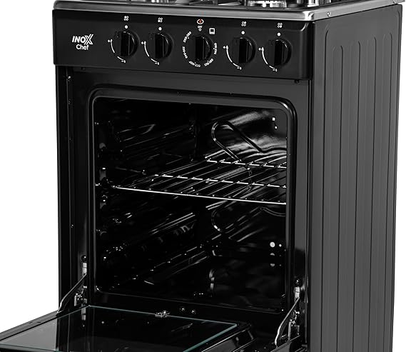La cocina independiente tiene 4 quemadores de gas de diferentes tamaños y potencias. Con un horno en la parte trasera, su diseño compacto en color negro se destaca. Los controles frontales y giratorios facilitan su uso. Hecho de acero, es robusto y duradero. Con una altura de 850 mm y un peso de 25 kg, es una opción práctica y funcional para tu cocina.