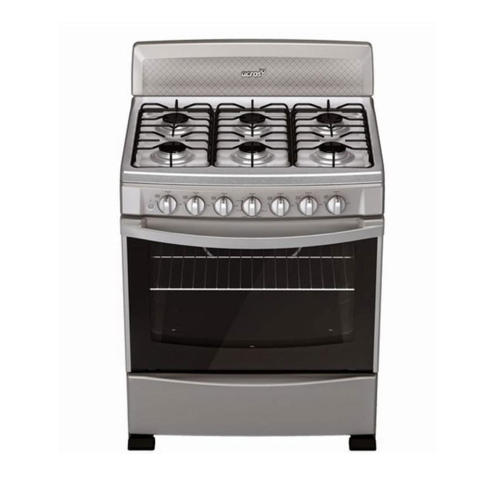 Con respaldo de cristal templado gris y cubierta de Acero Inoxidable. Cuenta con 3 parrillas de hierro fundido y 6 quemadores: 4 Estándar y 2 Súper.